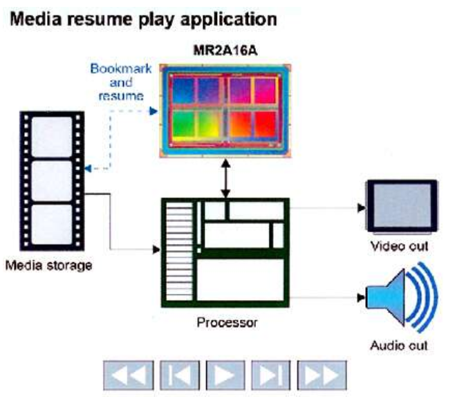 MRAM還適用于具有簡(jiǎn)歷播放功能的娛樂(lè)應(yīng)用程序。掉電期間,指示播放媒體時(shí)間戳的書(shū)簽會(huì)快速存儲(chǔ)在非易失性MRAM中。然后幾乎立即進(jìn)行后續(xù)播放并繼續(xù)播放(下圖1)。