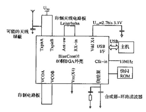 目前所有藍(lán)牙系統(tǒng)中天線的接收機(jī)╱發(fā)射機(jī)之間的高頻功能元件不是安在芯片上的。BlueCore模塊也不例外,但整個(gè)芯片是用CMOS技術(shù)制造的,接收機(jī)具有比雙極技術(shù)制造的設(shè)備的線性高得多,所以對(duì)濾波器實(shí)現(xiàn)較簡(jiǎn)單。