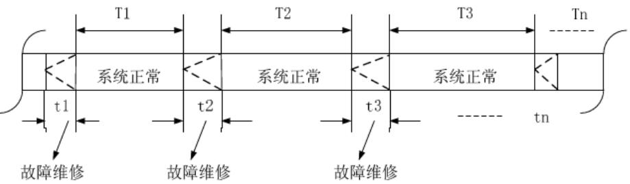 (1)可靠性,指某一時(shí)間段內(nèi)設(shè)備或系統(tǒng)連續(xù)運(yùn)行而無(wú)故障發(fā)生的概率。重要表征參數(shù)是平均無(wú)故障時(shí)間(Mean Time Between Failure,簡(jiǎn)稱MTBF)是指相鄰兩次故障之間的平均工作時(shí)間,也稱平均故障間隔時(shí)間。如圖1所示MTBF= ,系統(tǒng)故障率λ= 1/MTBF。