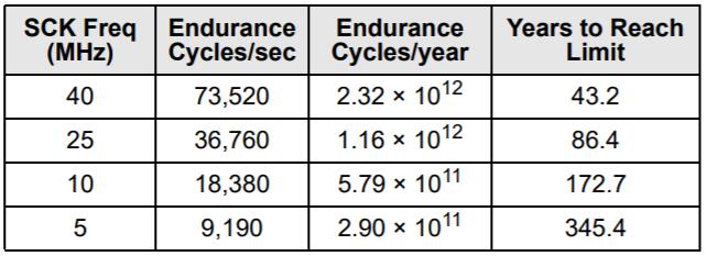 FeRAM存儲器具有讀取和還原機制。因此,對于存儲陣列的每次訪問(讀取或?qū)懭耄瑢葱惺┘幽途弥芷凇?FRAM體系結(jié)構(gòu)基于每個64位的16K行的行和列的陣列。整個行在內(nèi)部訪問一次,無論是讀取還是寫入一個字節(jié)或全部八個字節(jié)。在耐久性計算中,該行中的每個字節(jié)僅被計數(shù)一次。下圖顯示了一個64字節(jié)重復循環(huán)的耐久性計算,該循環(huán)包括一個操作碼,一個起始地址和一個順序的64字節(jié)數(shù)據(jù)流。這將導致每個字節(jié)在整個循環(huán)中經(jīng)歷一個持久周期。即使在40 MHz時鐘速率下,F(xiàn)RAM的讀寫持久性實際上也是無限的。