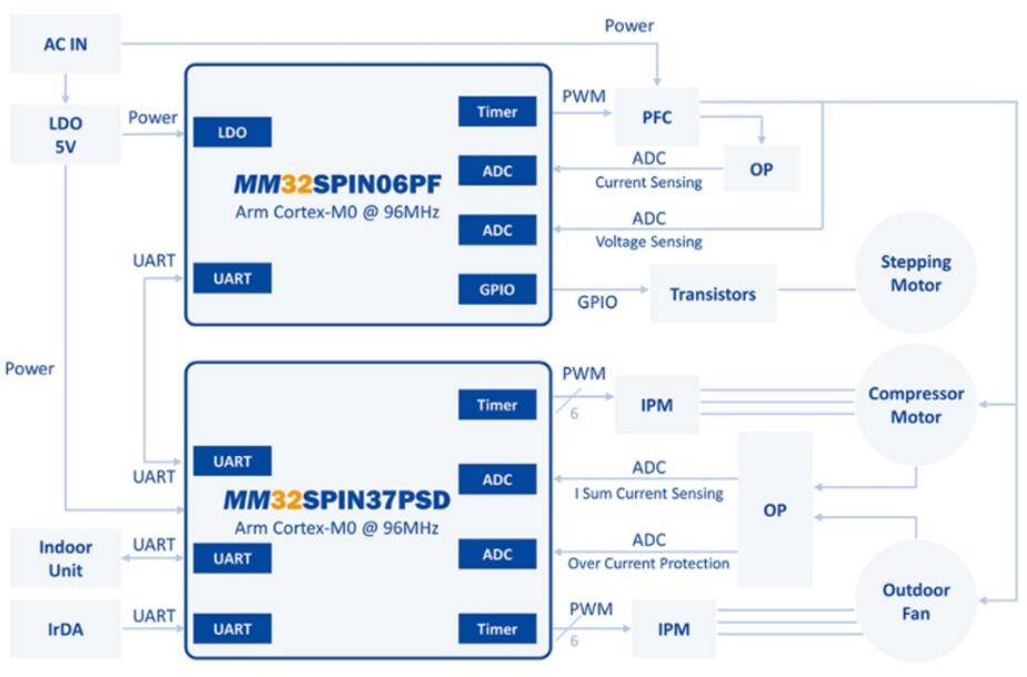 MM32SPIN06微控制器的空調(diào)外機方案如下圖所示,其中MM32SPIN37PSD(2個ArmCortex-M0內(nèi)核,最高主頻96MHz)和MM32SPIN06PF(基于ArmCortex-M0內(nèi)核的高性能32位微控制器,最高工作頻率可達96MHz)為主控制器。