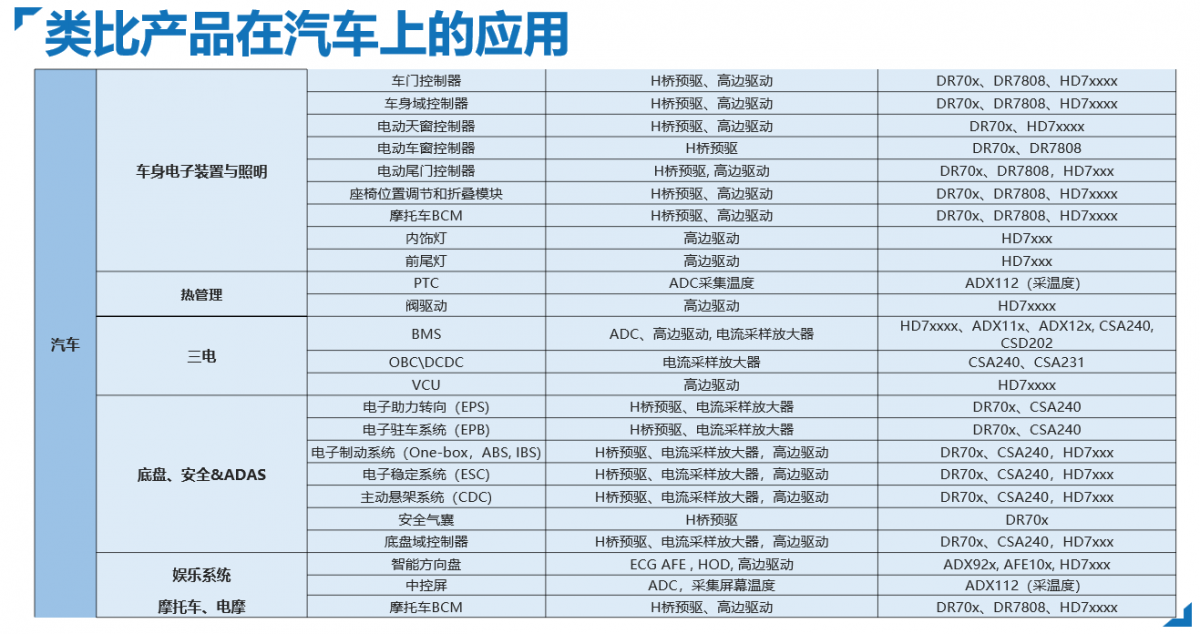 類比半導體高邊驅動產品可用于驅動車身控制域中的各種阻性、感性及容性負載的驅動,其在車內外的應用非常廣泛,包括車內飾燈、頭尾燈、座椅和方向盤及后視鏡加熱、電磁閥、門鎖、電機等場景。