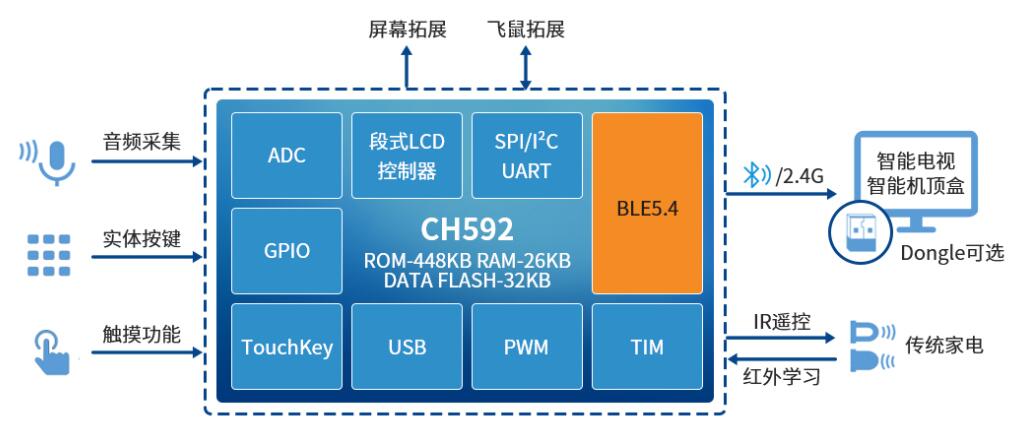 本方案基于沁恒CH592低功耗藍(lán)牙MCU,支持藍(lán)牙、2.4G和IR紅外遙控模式。遙控器可與電視機(jī)、機(jī)頂盒直連,也可通過配套的藍(lán)牙/2.4G Dongle建立連接。