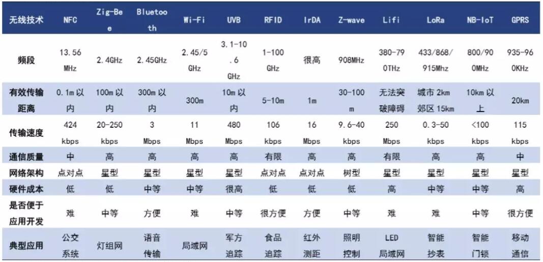 無(wú)線通信技術(shù)主要分廣域網(wǎng)和局域網(wǎng)兩種,具體差別在傳輸距離和通信協(xié)議方面。局域網(wǎng)無(wú)線通信技術(shù)包括、WIFI、藍(lán)牙、ZigBee、UWB、RFID、LiFi等,傳輸一般在0-300米;廣域網(wǎng)無(wú)線通信技術(shù)包括GPRS、LoRa、NB-IoT等,有效傳輸距離在公里級(jí)。藍(lán)牙是最主要的局域網(wǎng)(短距離)無(wú)線通信方式之一,適合覆蓋距離在百米以內(nèi)、數(shù)據(jù)傳輸量較小的通信。