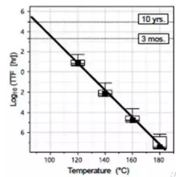 圖3.一組1Gb裸片的數(shù)據(jù)保留(DR)烘烤的失效時間與溫度的關(guān)系。實線擬合表示在85°C情況下為10年的DR,在100°C情況下為3個月的DR。