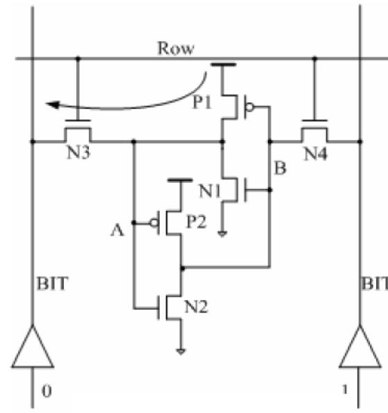在六管單元的寫操作中,外部電路驅動兩個互補的信號到位線BIT 和BIT_上,字線驅動器驅動字線ROW 到高電平,位線信號經兩個傳輸管寫入存儲節點。如圖3.6 所示的正是向存有“1”的單元寫“0”的情況,也就是把A 點的電平由VDD 下拉至GND。