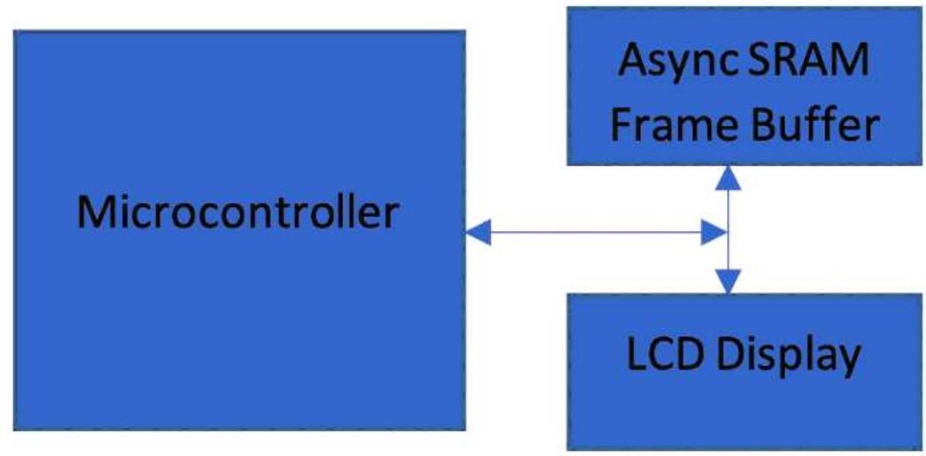 SRAM將無(wú)法提供足夠的容量或性能。為了避免畫(huà)面撕裂,也有必要采用雙緩存。在這些系統(tǒng)中通常在外部存儲(chǔ)器中實(shí)現(xiàn)幀緩存。在刷新周期中,從外部幀緩存讀取數(shù)據(jù),并連同控制信號(hào)輸出給顯示控制器數(shù)據(jù)總線(xiàn)。圖1所示的是采用外部幀緩存的典型顯示框圖。
