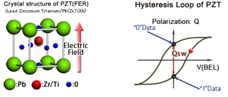 FRAM或鐵電隨機(jī)存取存儲(chǔ)器使用1個(gè)晶體管–1個(gè)鐵電電容器(1T-1FC)架構(gòu),該架構(gòu)采用鐵電材料作為存儲(chǔ)設(shè)備。這些材料的固有電偶極子在外部電場(chǎng)的作用下轉(zhuǎn)換為相反極性。改變鐵電極化態(tài)需要偶極子(位于氧八面體中的Ti4+離子)移動(dòng)(在Pb(Zr,Ti)O3的情況下)對(duì)電場(chǎng)的響應(yīng)(圖4)。自由電荷或其他隨時(shí)間和溫度累積的離子缺陷會(huì)阻止這種運(yùn)動(dòng),這些缺陷會(huì)導(dǎo)致偶極子隨時(shí)間松弛,從而導(dǎo)致疲勞。