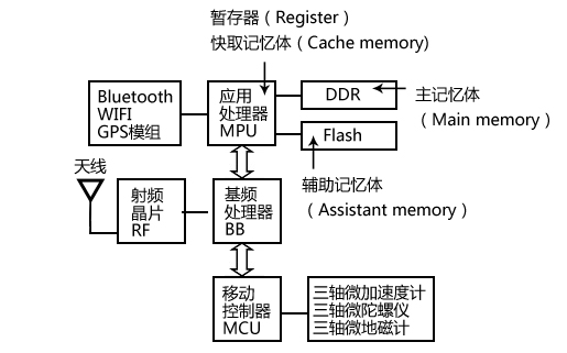 應用處理器主要是執行操作系統(Operating System,OS)與應用程序(Application program,App),暫存器與快取存儲器目前都是內建在處理器內,其中暫存器用來設定處理器的功能,用來設定暫存器數值的程序,也就是用來趨動硬件的軟件程序又稱為“固件”(Firmware);快取存儲器是在執行程序時用來“暫時儲存”程序與資料的地方,由于在處理器內離運算單元比較近,可以縮短程序與資料來回的時間,加快程序的執行速度因此稱為“快取”(Cache)。