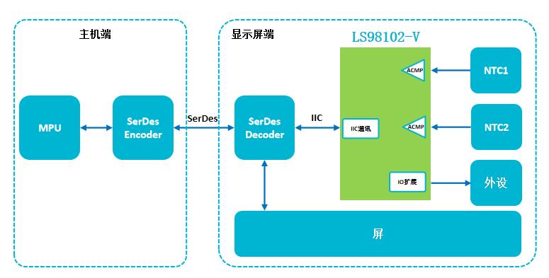 現(xiàn)場可重構(gòu)IC LS98102/-V采用QFN14封裝(車規(guī)級),供電范圍2.3V~5.5V,靜態(tài)電流100nA,12個可任意配置GPIO。該器件具有監(jiān)控2路NTC的溫度,溫度異常時發(fā)出中斷給SerDes端,主機控制發(fā)出關屏等指令信息擴展GPIO口,用于控制顯示屏端其他外設。
